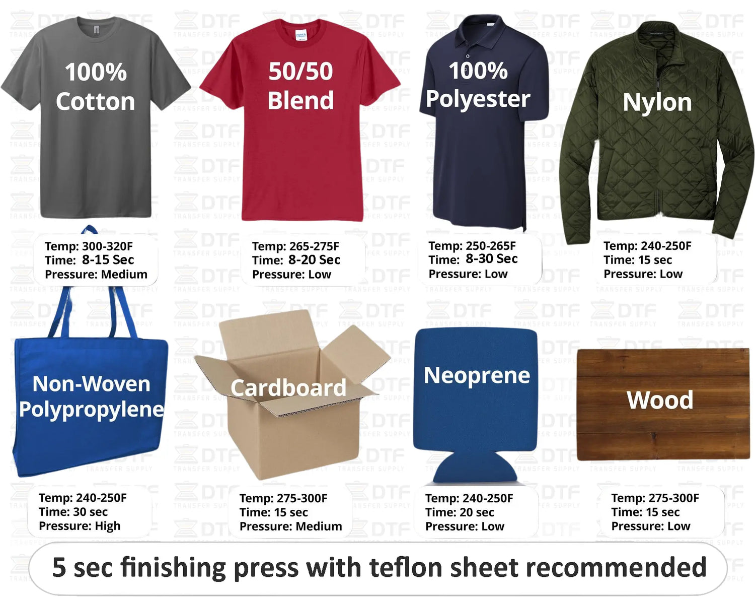 Place a Teflon sheet (recommended) or parchment/butcher paper to enhance feel, increase durability and remove shine. Press at same temperature for 5 seconds.