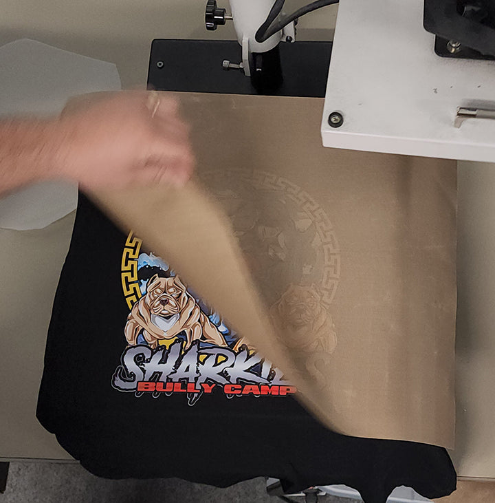 Release the press and depending on how small the details in your design are you can instantly peel or wait until cool. Lift the transfer from one corner and gently peel in one consistent motion. Small details may need to be cold peeled but most designs can be peeled instantly.